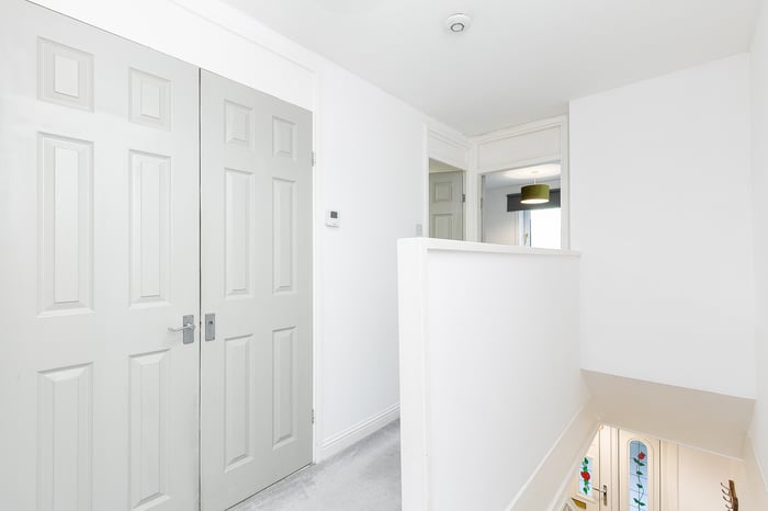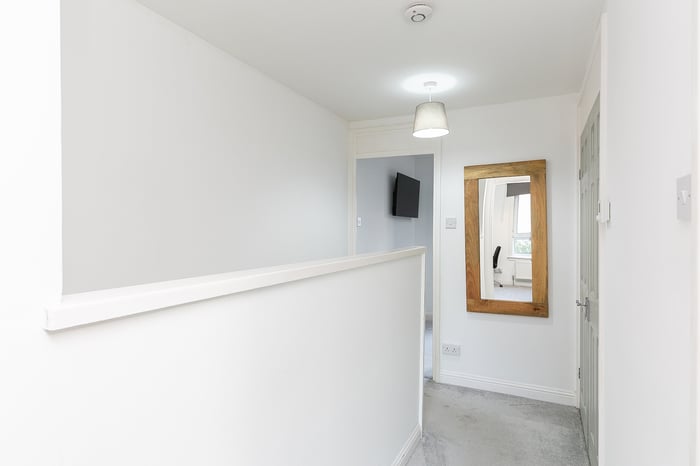 Set to the front, the kitchen is fitted with modern units and worktops, a stainless steel sink with drainer, and a splashback surround. Appliances include an integrated oven and gas hob; whilst ample space is available in both the kitchen and the utility cupboard upstairs for further white goods. On the upper floor, the master bedroom is set to the rear with carpeted flooring, a built-in storage cupboard, a TV wall mount and a modern en-suite shower room.