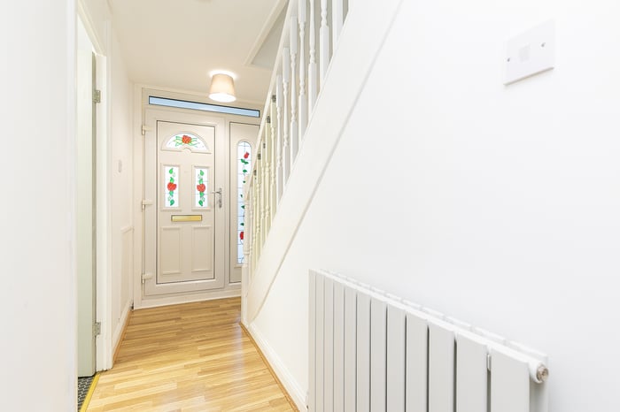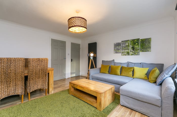 The entrance hall gives access to the ground floor and to the stairs leading to the upper floor. With wood effect flooring extending from the hall, the living/dining room is set to the rear featuring ample space for both lounge and dining furniture, a storage cupboard and a central light fitting.