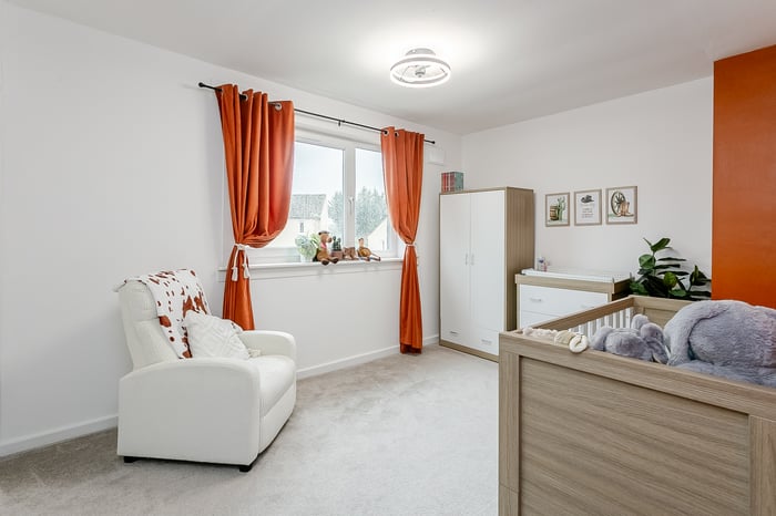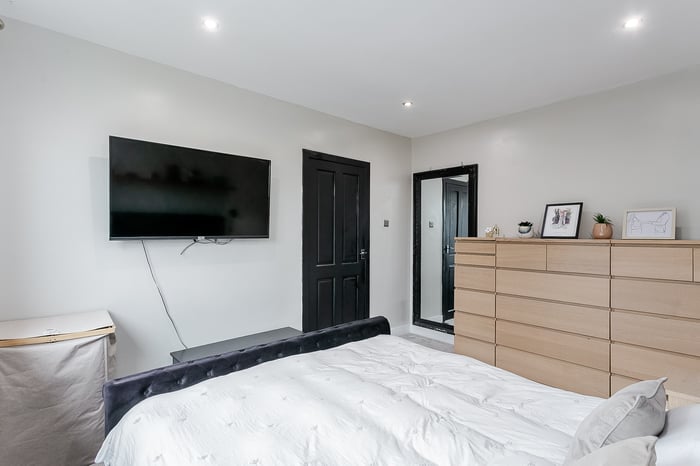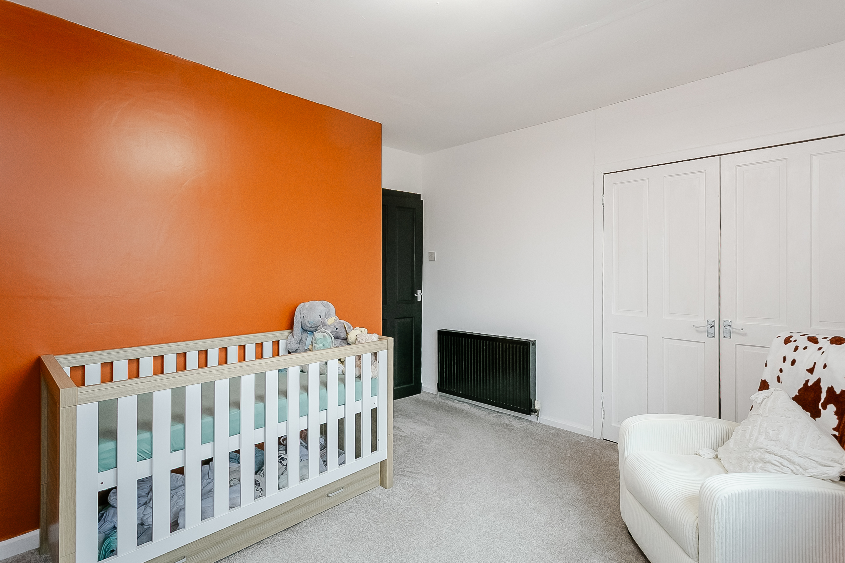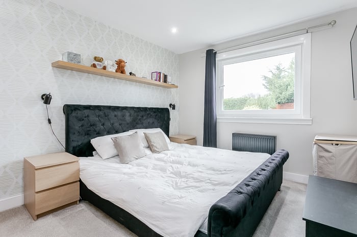 Bedroom two is also carpeted and is well-suited as a second bedroom, guest room or home office. The room benefits from a wall-mounted TV point and offers flexibility for a variety of uses, with space for a bed and storage as required.