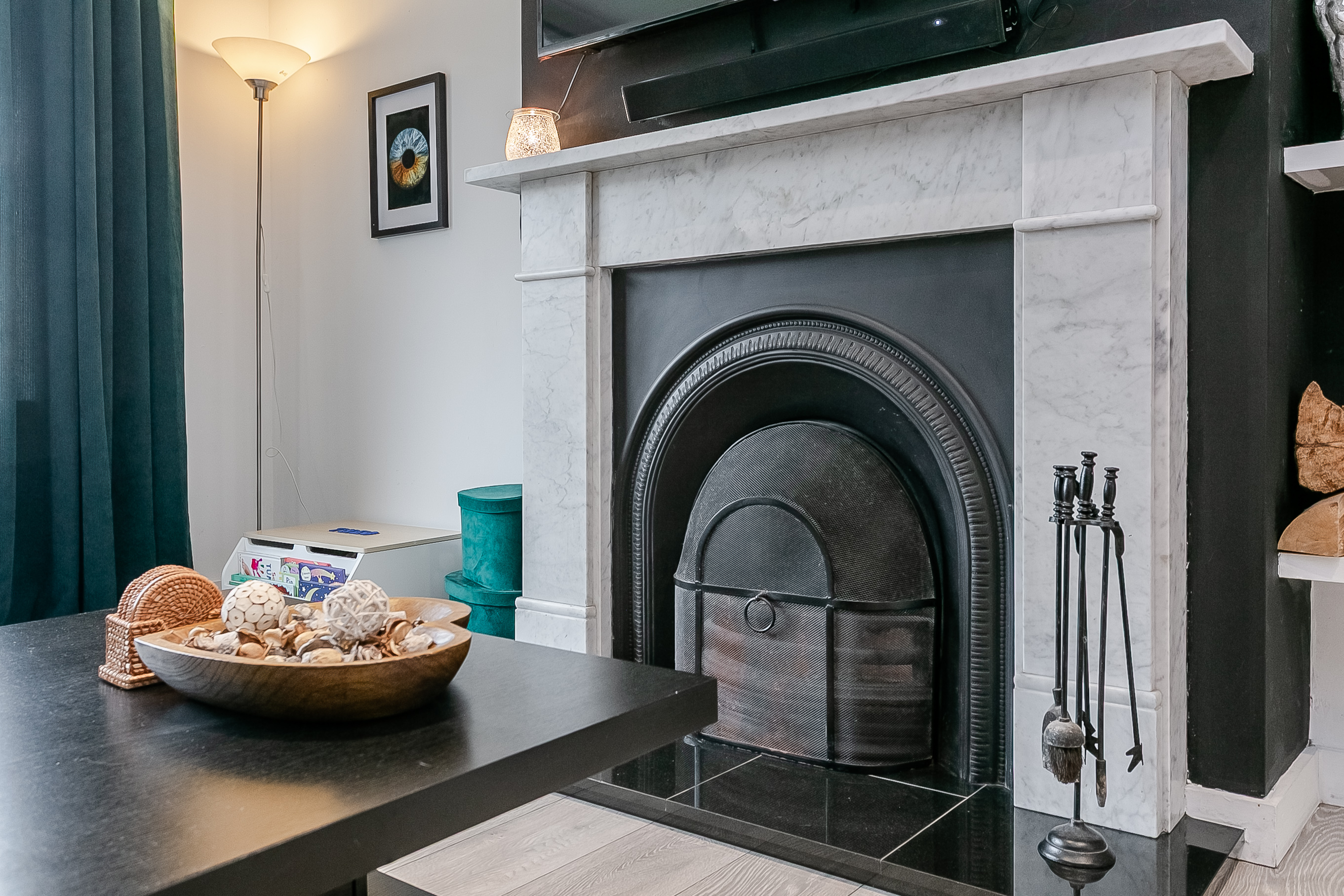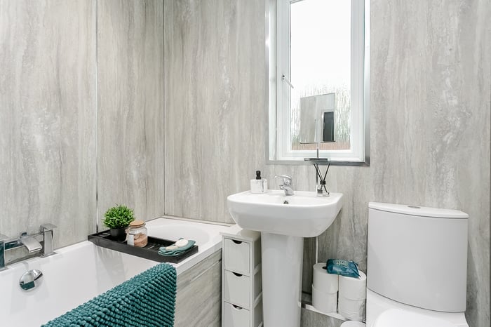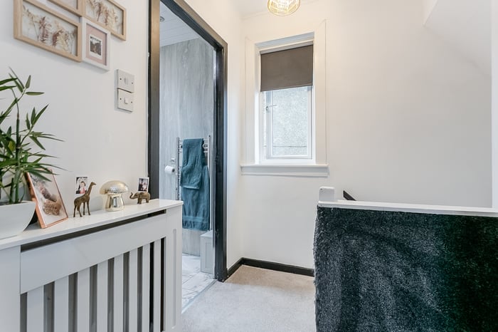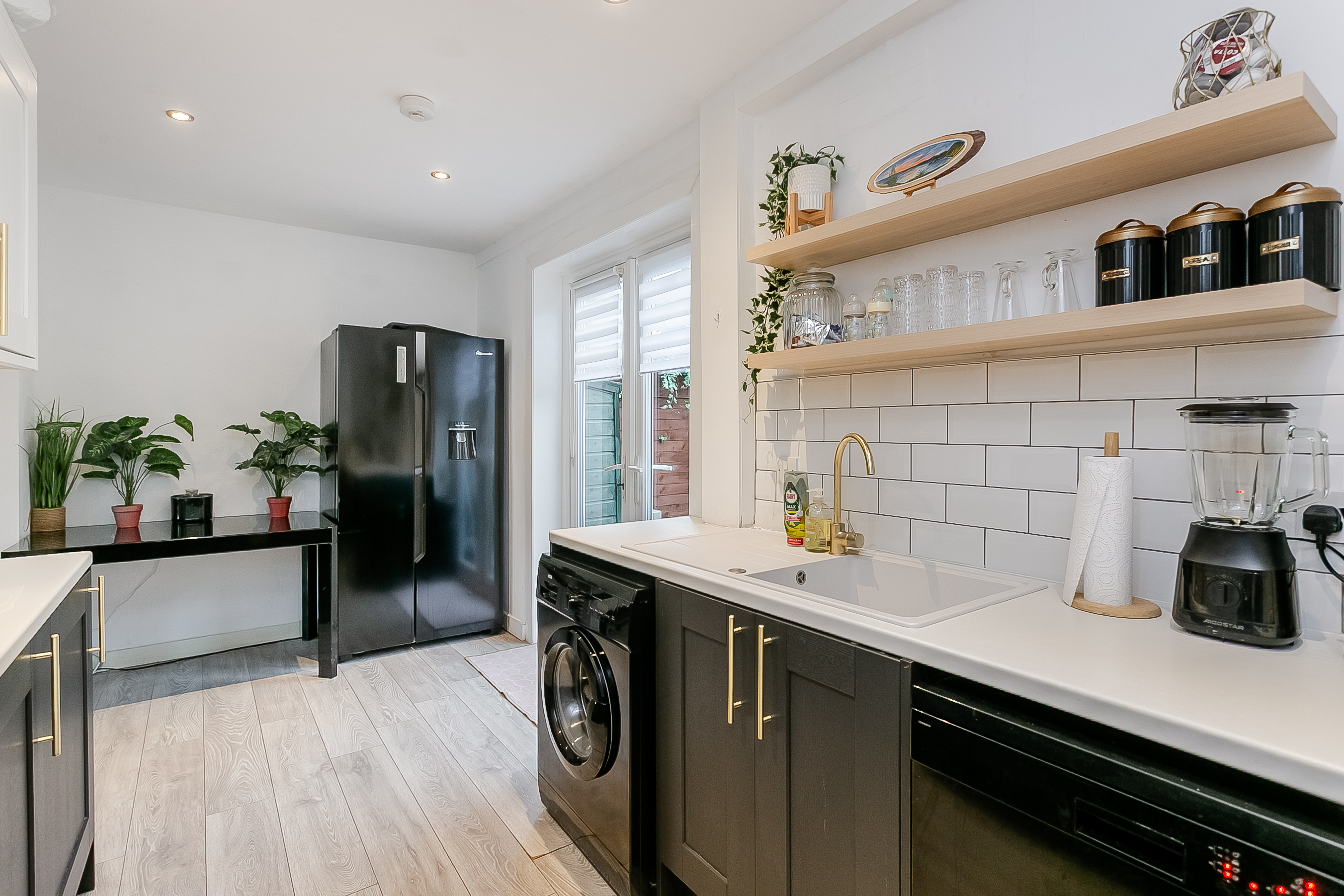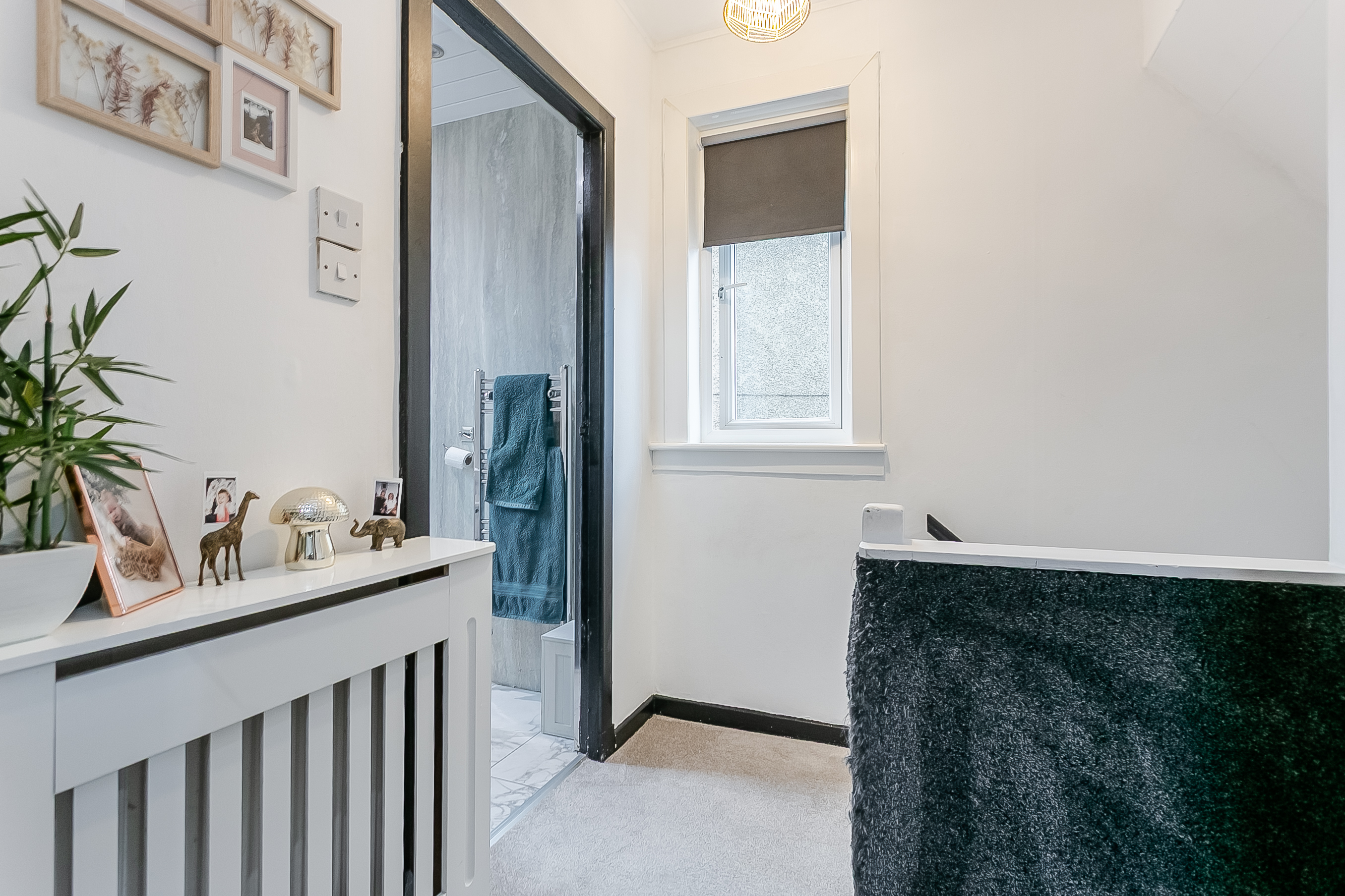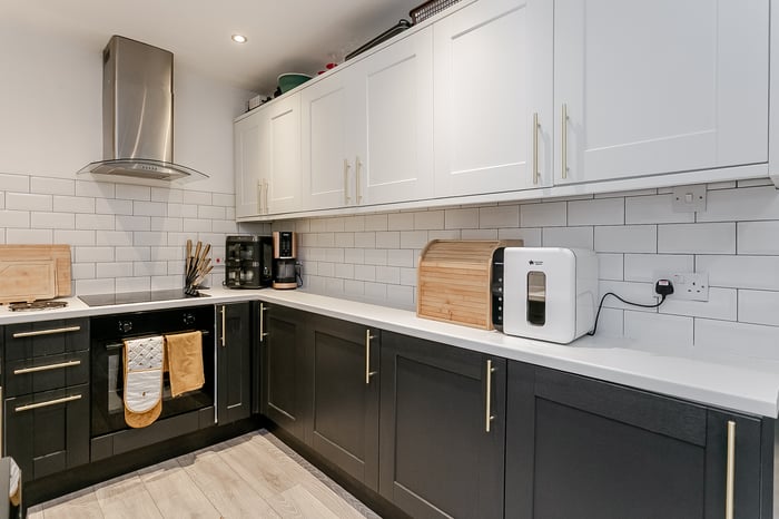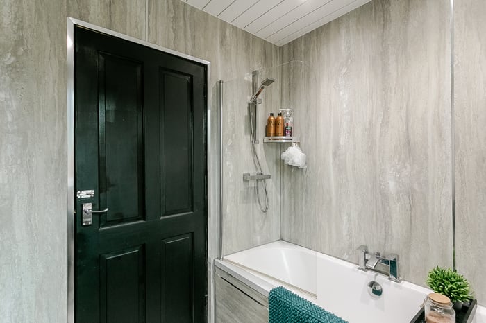 Completing the property, the modern fitted three-piece bathroom features marble-effect tiled flooring, a stone-effect splashback surround and contemporary spotlighting. The suite includes a bath with a shower over, a ladder-style radiator and stylish finishes throughout, creating a sleek and functional space.