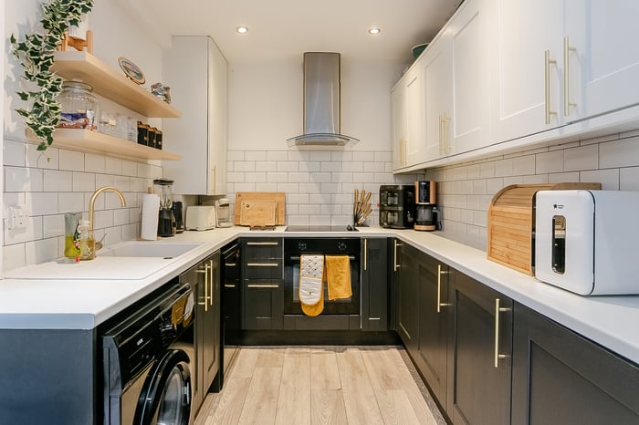 The space is well laid out for everyday living and dining, with spotlighting and French patio doors providing a bright and contemporary feel. A sink with a drainer sits beneath the worktop, while appliances include a fridge/freezer, washing machine, dishwasher, integrated oven and an electric hob with a canopy extractor above.