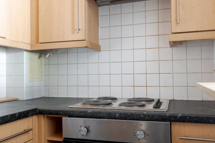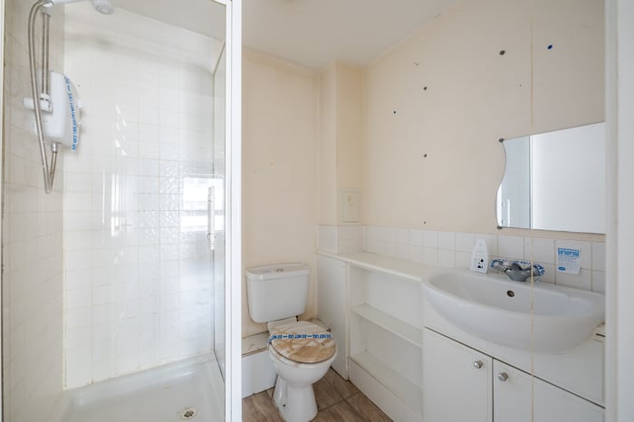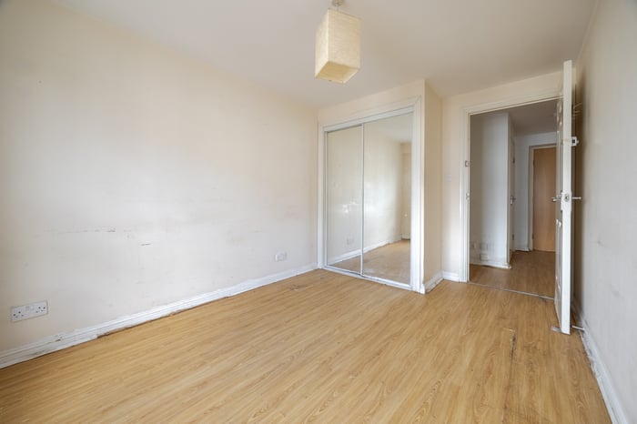 The second bedroom, positioned next to the first, also includes a built-in wardrobe with mirrored sliding doors and offers comfortable proportions suitable for a double bed or home office use. A three-piece bathroom completes the accommodation, featuring a tiled splashback, matching tiled flooring, and a white suite.