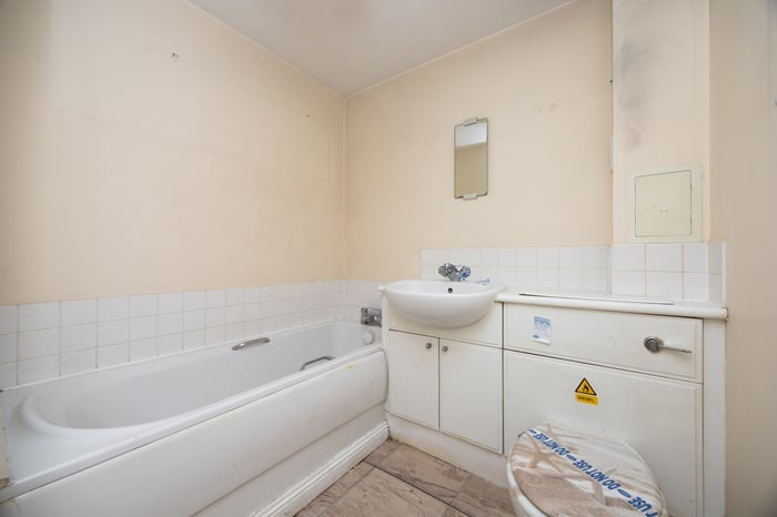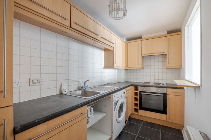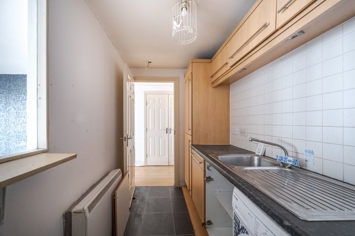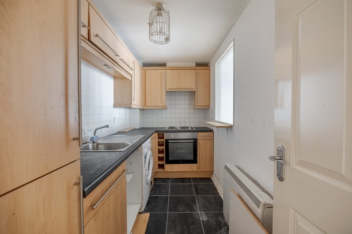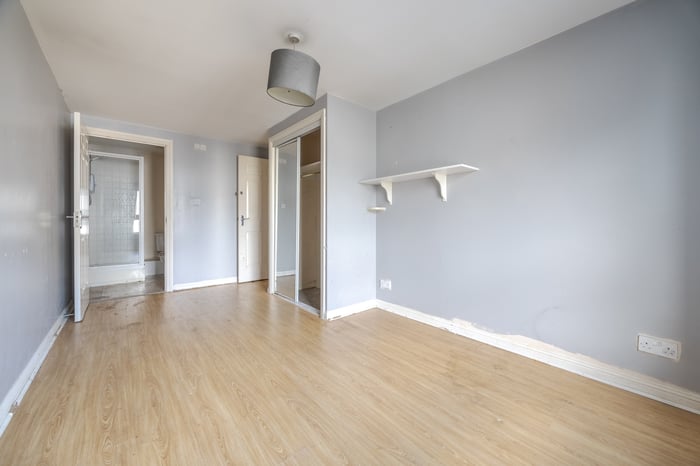 Included appliances comprise a washing machine, oven, fridge/freezer, and gas hob (no warranty will be given with any of the appliances included in the sale). Bedroom one benefits from wood-effect flooring, a built-in wardrobe with mirrored sliding doors, and direct access to a private en-suite.