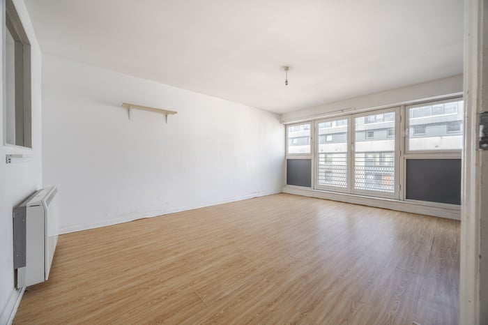 The spacious lounge features wood-effect flooring, a central light fitting, and French doors leading to a private balcony. The fitted kitchen is finished with a tiled splashback, stone-effect worktops, tiled-effect flooring, and a stainless-steel sink with drainer.