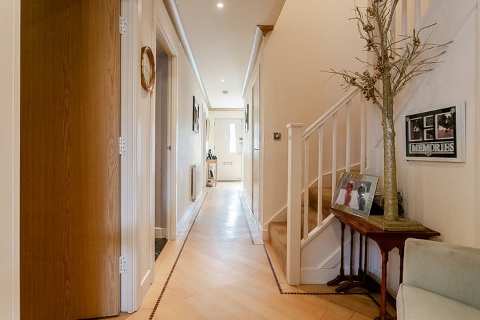 A welcoming entrance hall affords access throughout the ground floor, including a convenient WC and storage cupboard. To the rear, a generous living room boasts French doors opening directly to the private garden – perfect for indoor/outdoor living and entertaining.