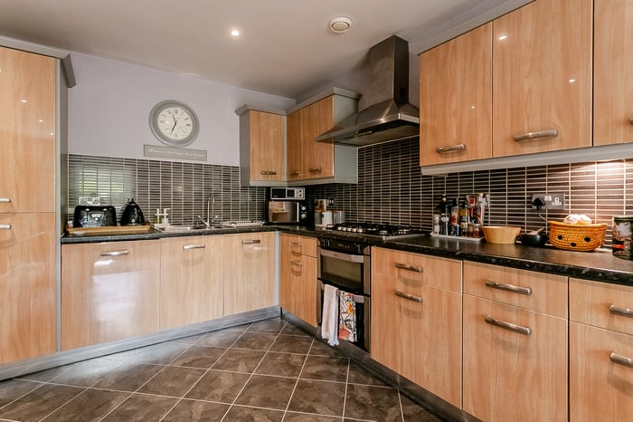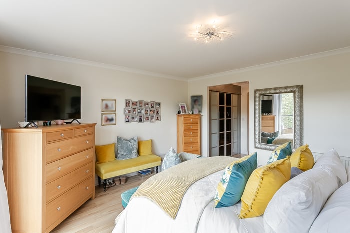 There is ample space for both lounge and dining furniture, if desired. Set to the front, an exceptionally spacious kitchen is fitted with modern units and worktops, a tiled surround, a sink with a drainer, and a range of integrated appliances including a double oven, a five-ring gas hob, a fridge/freezer and a dishwasher.