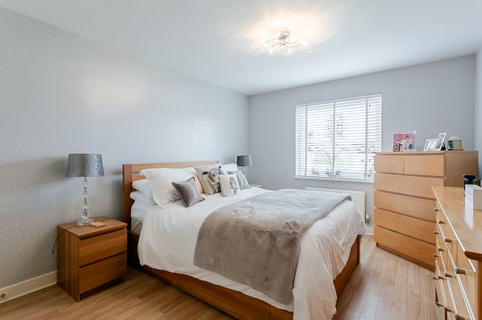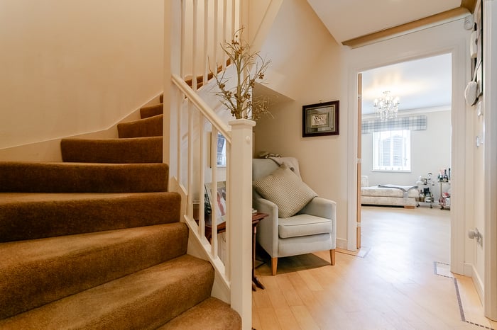 Upstairs, the bright and airy master bedroom enjoys a sunny, southerly aspect and features a built-in wardrobe, a modern en-suite shower room, and patio doors opening onto a private balcony – a tranquil spot for morning coffee or evening relaxation. Two further double bedrooms are set to the rear, both offering built-in storage and stylish finishes.