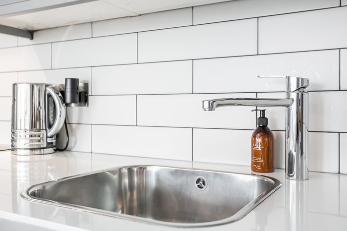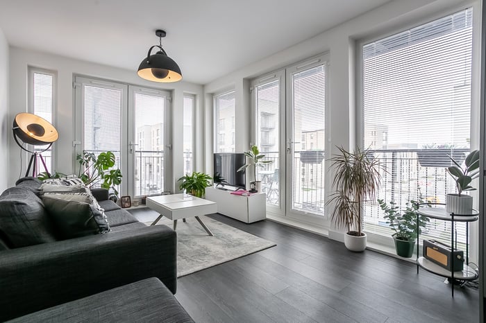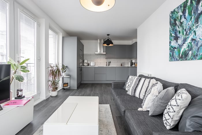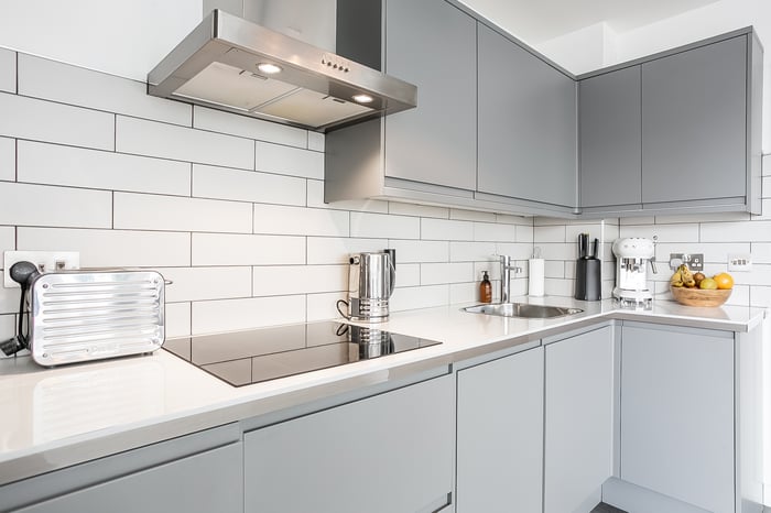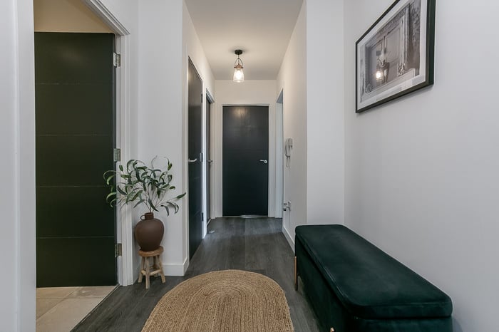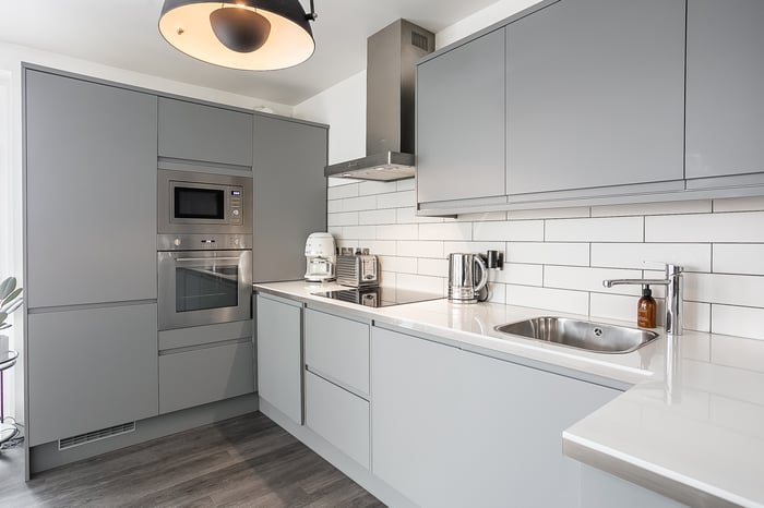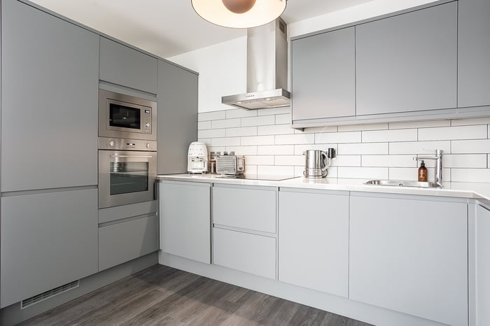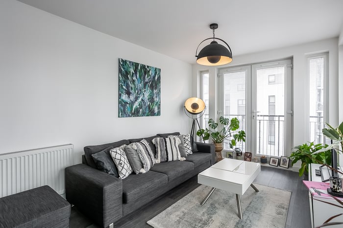 An impressive public room takes advantage of the property’s corner aspect, with superb natural light from floor-to-ceiling windows and French patio doors leading to two balconies. A stylish kitchen is fitted with modern units and worktops, a tiled surround, a sink; and an integrated dishwasher, washing machine, fridge/freezer, microwave, oven and an induction hob.