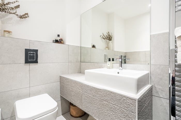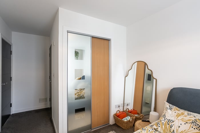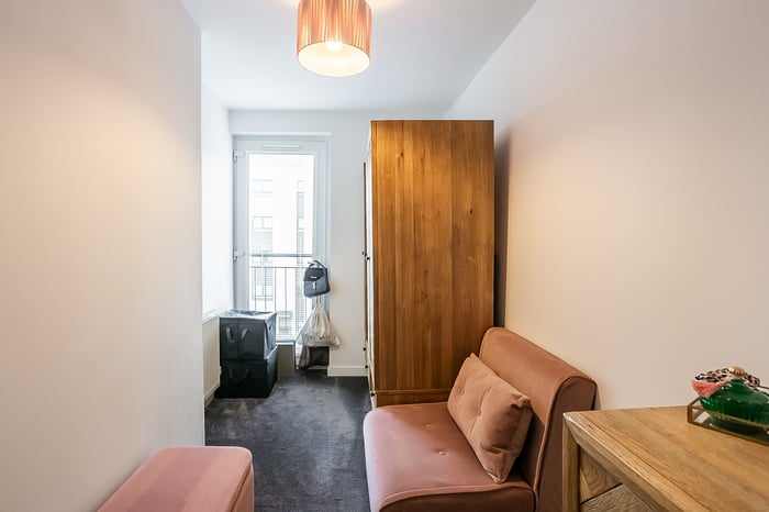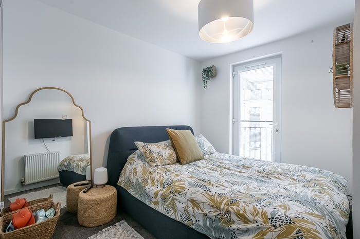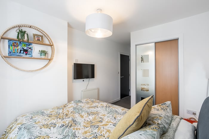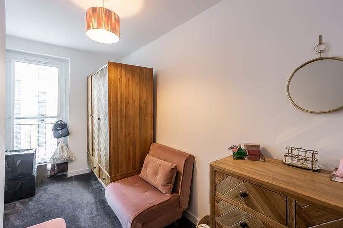 A tastefully finished master bedroom features carpeted flooring, a wall-mount TV point, a built-in mirrored wardrobe, a Juliet balcony; and a generous en-suite shower room with a large integrated cubicle, a stylish sink, tiled splash walls and a ladder-style radiator. A flexible single bedroom also features carpeted flooring and a Juliet balcony.