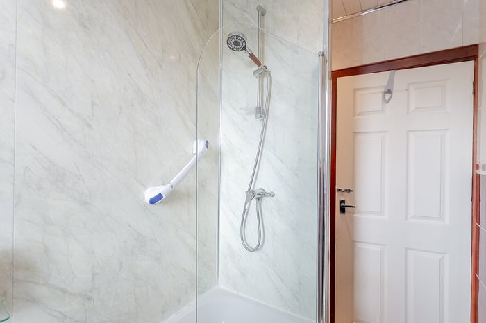 Completing the accommodation, the bathroom is fitted with a three-piece suite including a shower over the bath, and partially tiled and partially panelled splash walls.