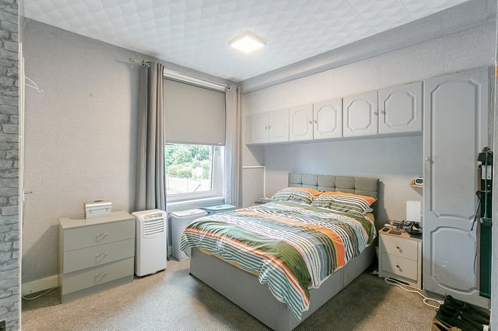 A generous main bedroom is set to the front, with carpeted flooring, a built-in cupboard, a wall-mounted TV point and overbed fitted storage. A further bedroom is set to the rear, overlooking the garden.