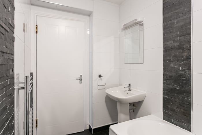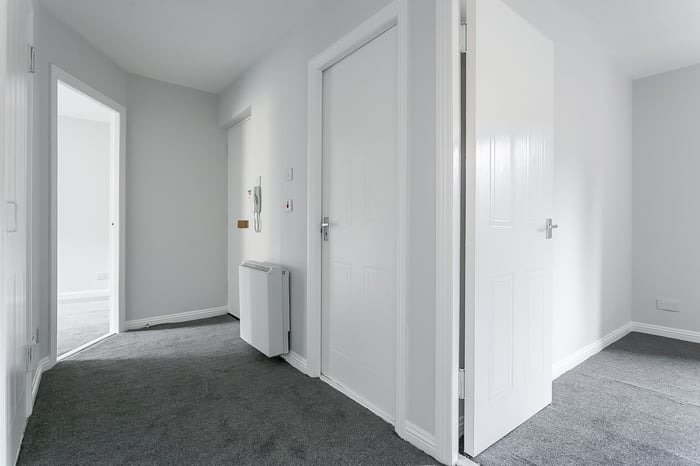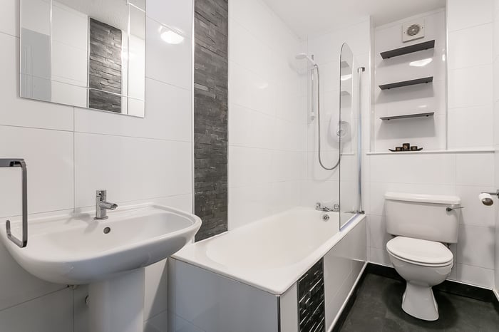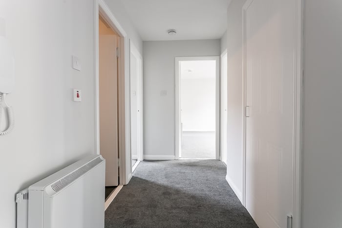 The principal bedroom benefits from a built-in mirrored wardrobe, a TV point, and carpeted flooring, while the two further bedrooms offer flexible spaces, even suitable for a guest room or home office. The modern, internally set bathroom is fitted with a three-piece suite, a mains shower over the bath, tiled walls, and a chrome ladder-style radiator.