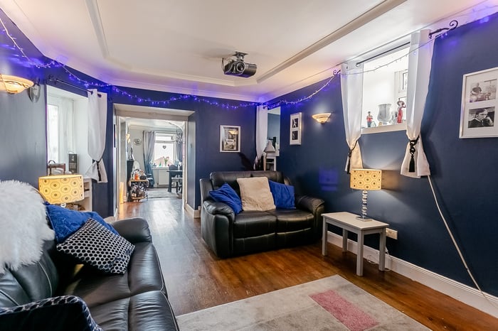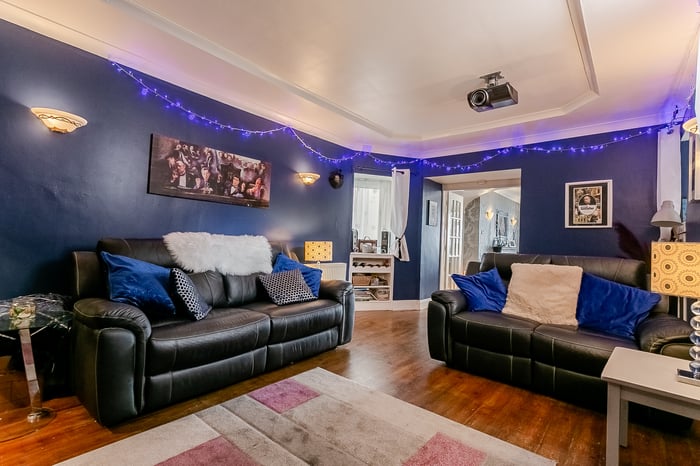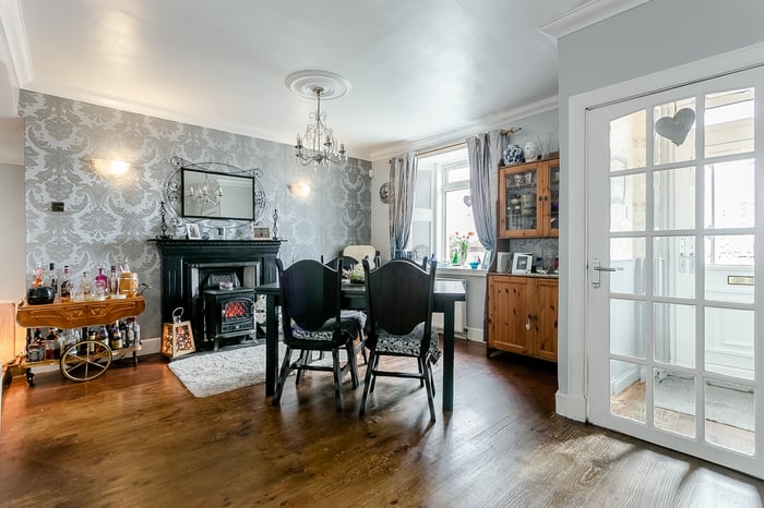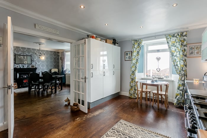 Light-filled and stylishly updated three-bedroom period villa with private gardens, elevated sea views, and a flexible layout just moments from the Buckhaven waterfront. A vestibule opens to a spacious dining and family room with hardwood flooring, a period fireplace, and understair storage.