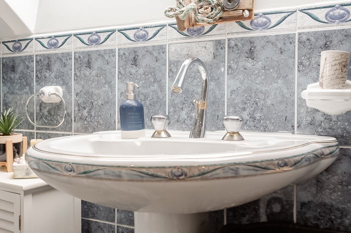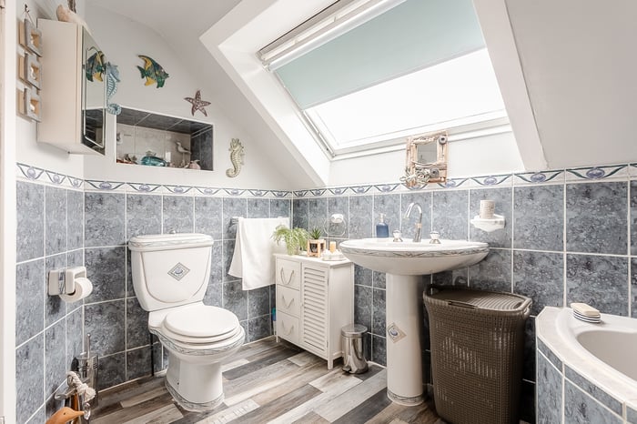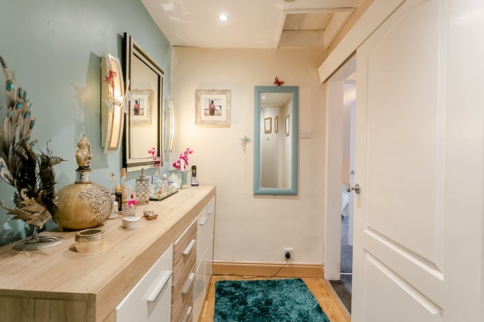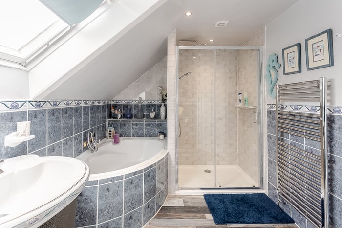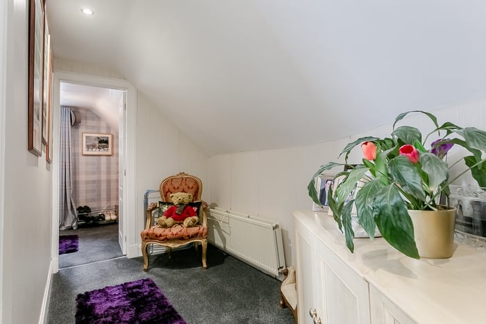 Upstairs, the main hall has two store cupboards and accesses two double bedrooms, including the front-facing principal with wardrobes and sea views. A second hall with a sliding door offers storage space and leads to the family bathroom with a corner bath, separate shower, and quality imported fittings.