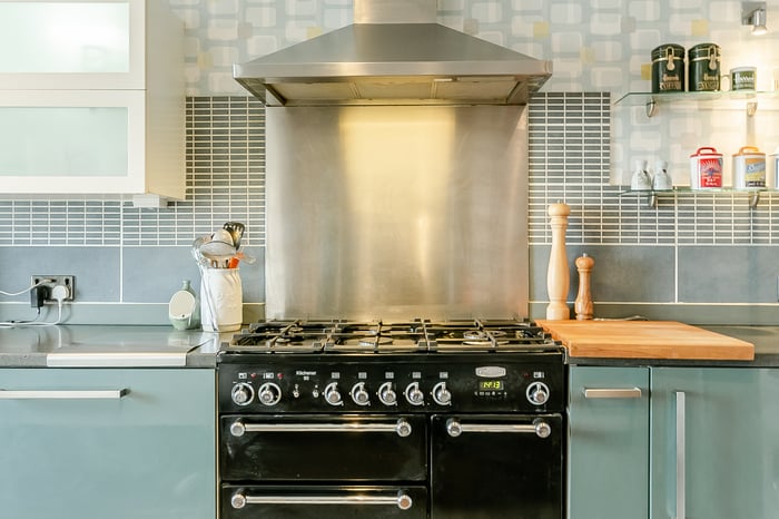 French doors lead to a large kitchen with modern units, features and recessed lighting, hardwood flooring, and space for a breakfast table. Appliances include a range cooker, washing machine, dishwasher, and American-style fridge/freezer.