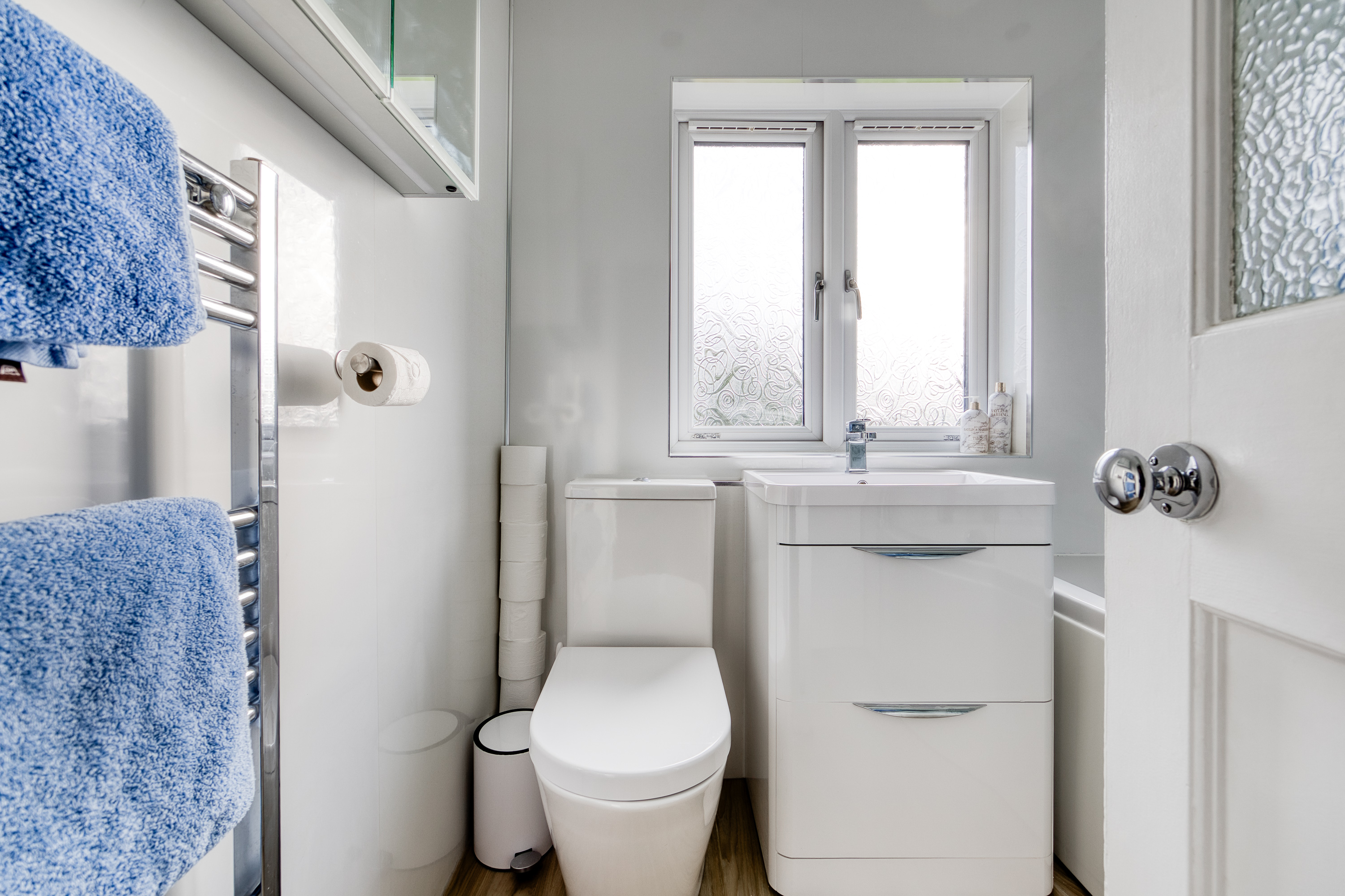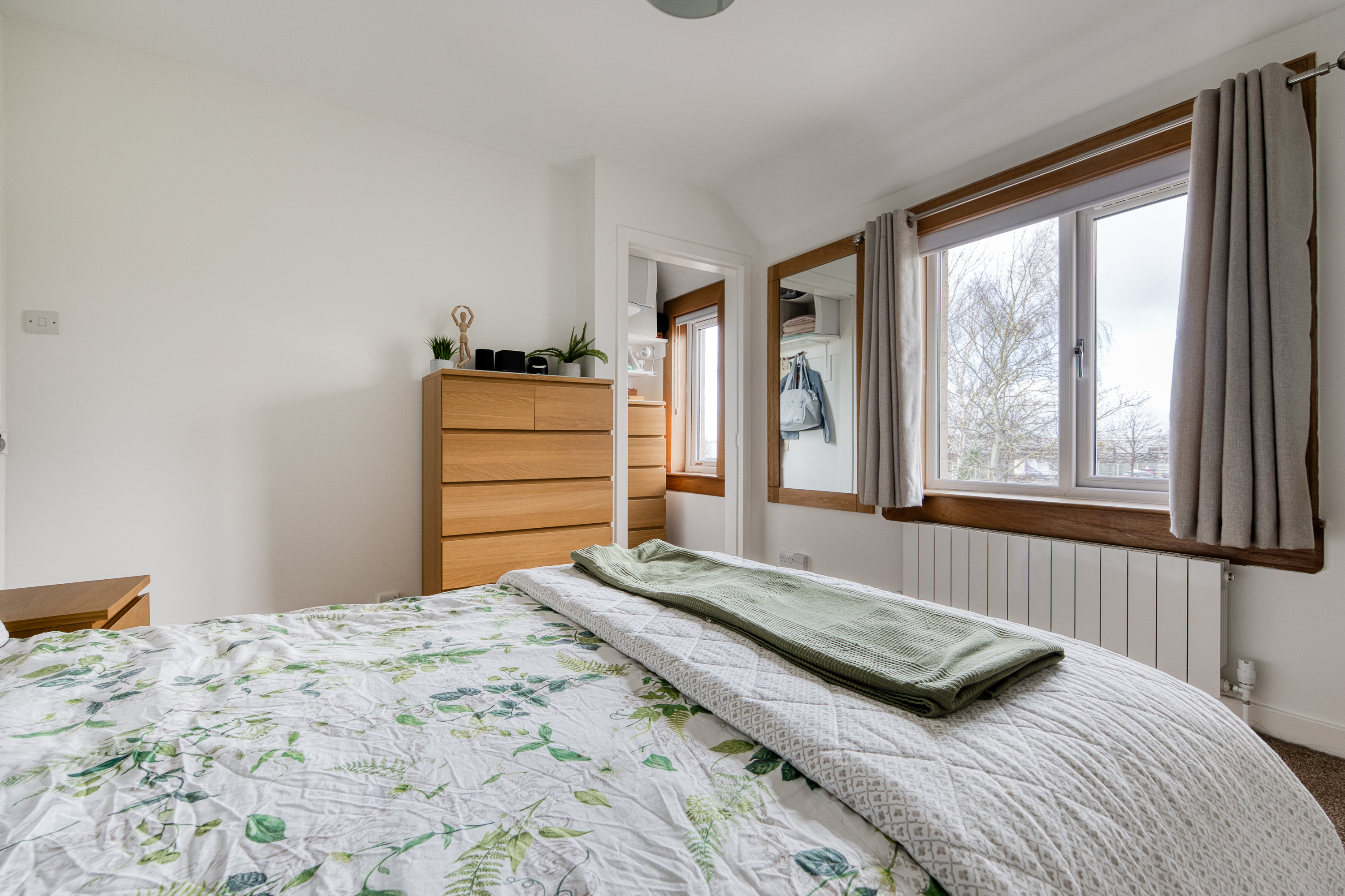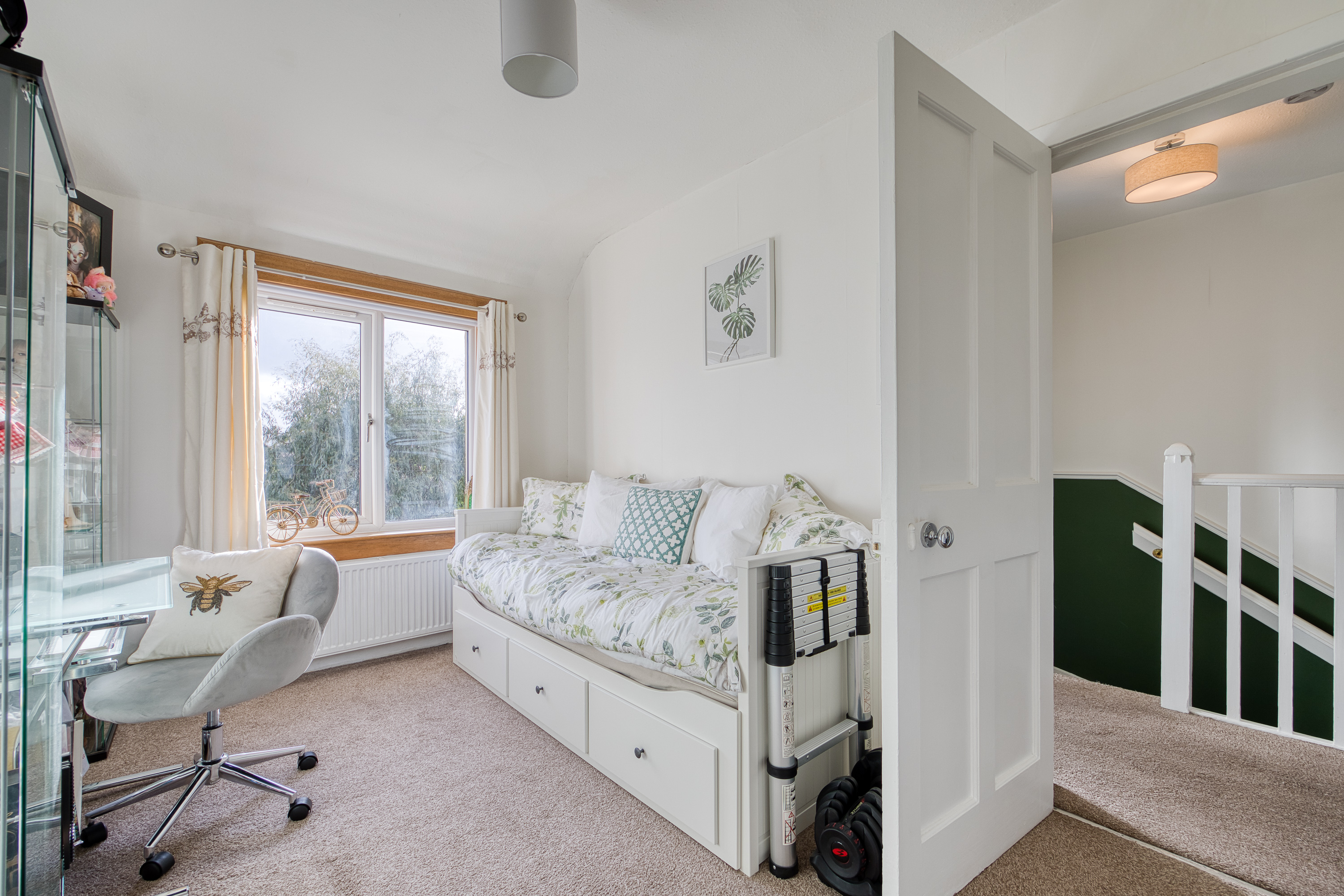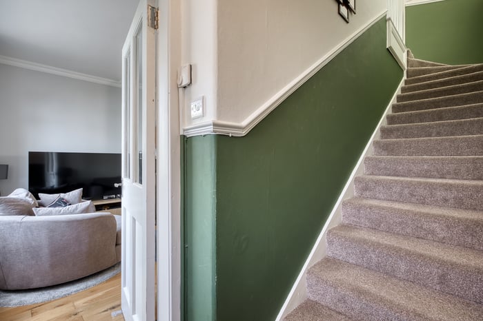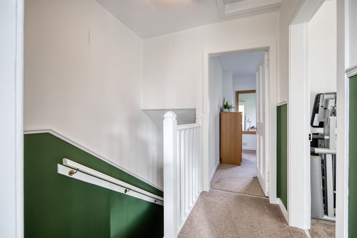 Heading upstairs, the carpeted landing provides access to the bedrooms, all finished in light tones and décor with carpeted flooring and large windows allowing plenty of natural light throughout. Completing the property is the family bathroom, presented as a three-piece suite with a P-shaped shower over the bath and a ladder-style radiator.