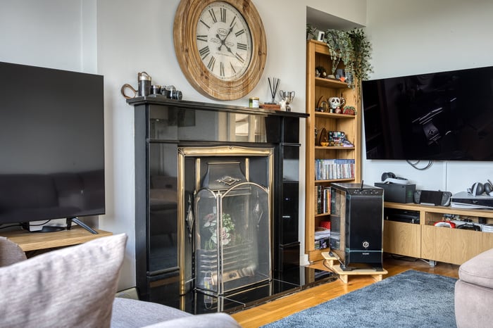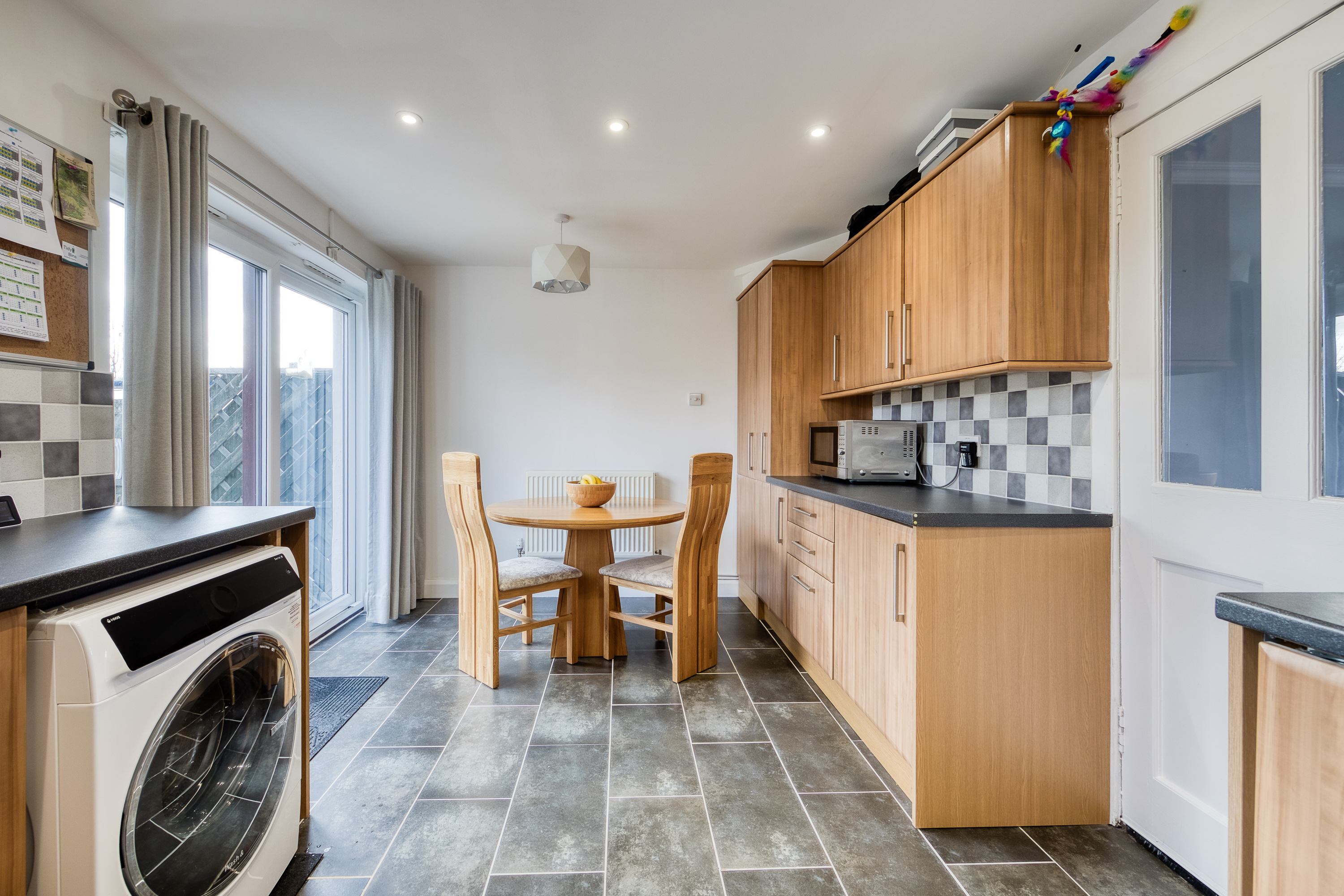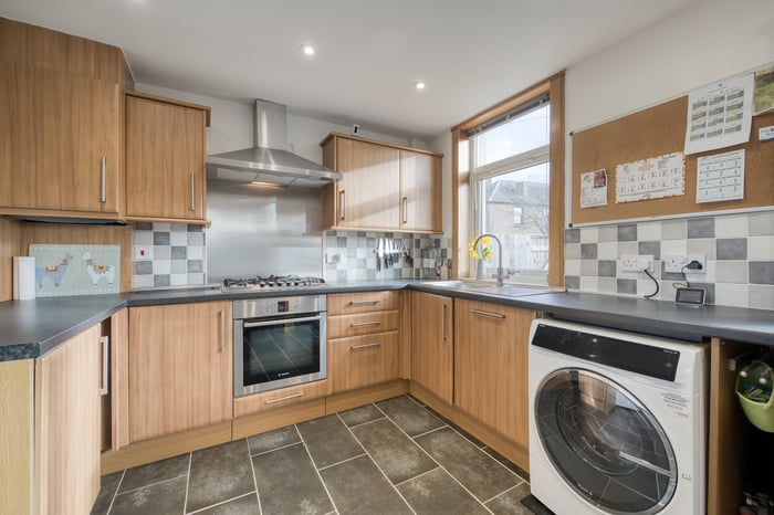 The living room flows seamlessly into the kitchen/dining area, with the space providing direct access to the private rear garden, making it an exceptional setting for entertaining guests. The kitchen offers a modern finish with granite-effect countertops, a tiled-effect splashback, an integrated oven and five-ring gas hob with canopy above, along with space for additional appliances.