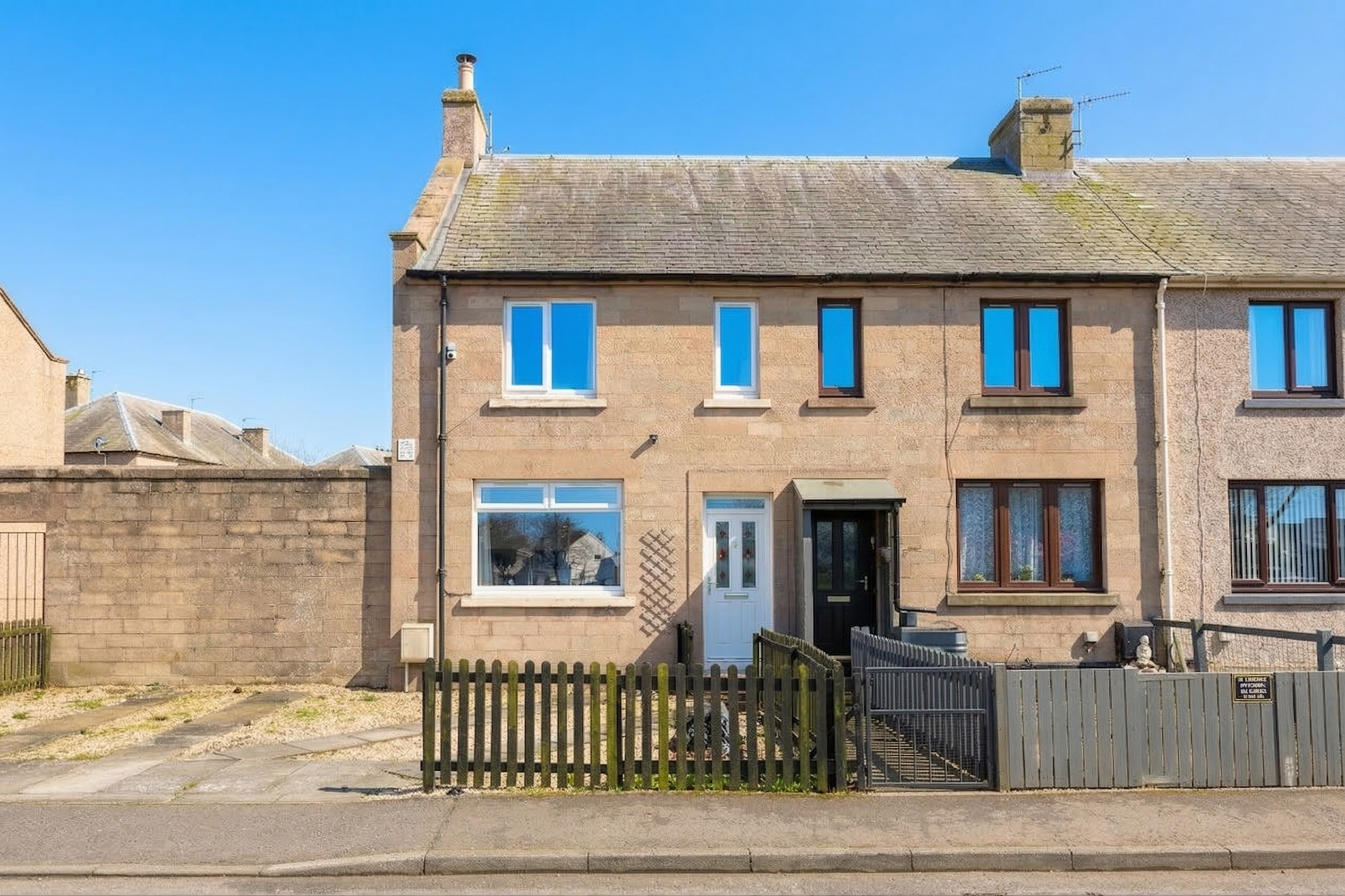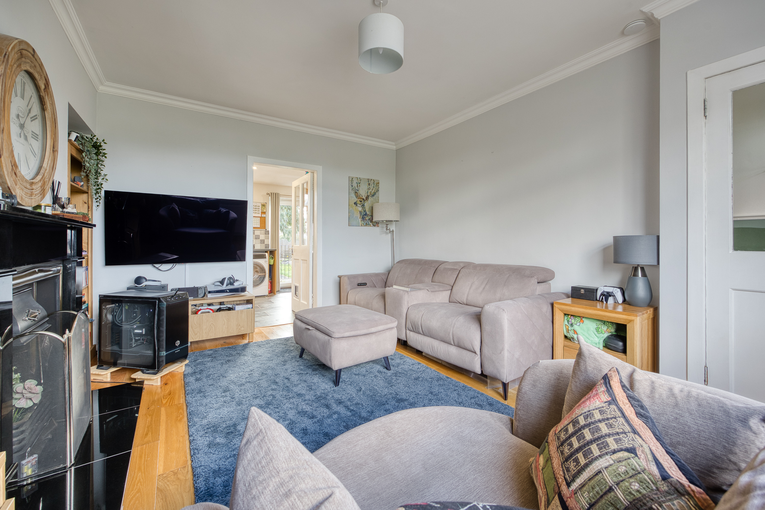 Beautifully presented two-bedroom end-terrace home with front and rear gardens and a private driveway. Situated within a modern, family-friendly residential development in Whitecraig, East Lothian. A welcoming entrance provides access that leads directly through to the living room, finished with contemporary flooring and light décor, and benefiting from a wall-mounted TV point while also featuring a fireplace that creates a charming and inviting atmosphere.