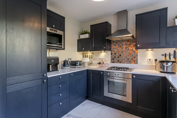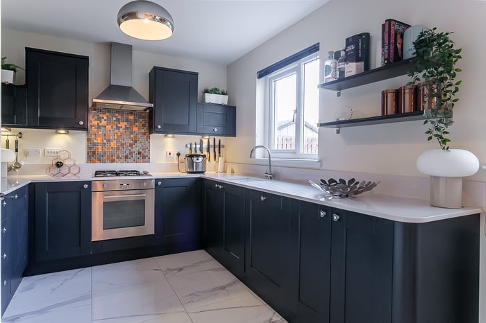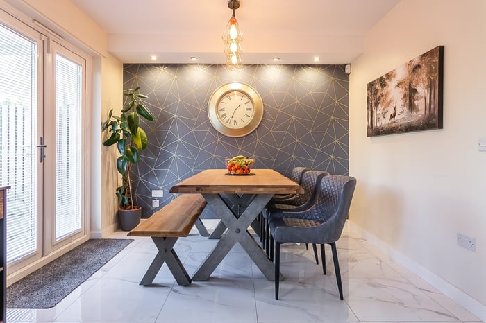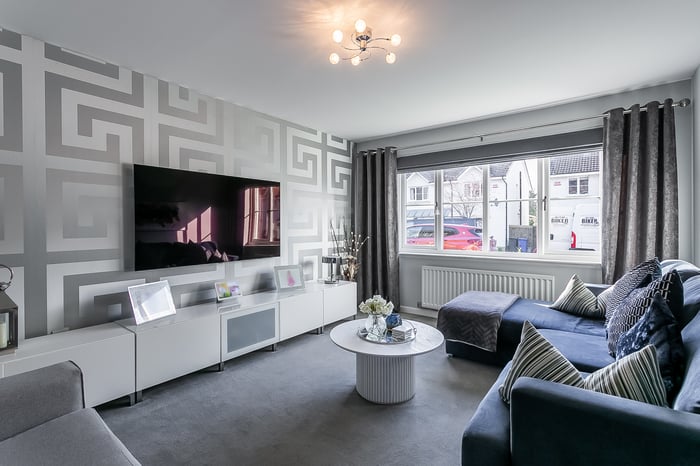 Set to the front, a tastefully finished living room has carpeted flooring, a wall-mount TV point, and a central light fitting; whilst set to the rear, a generous and bright dining/kitchen has French patio doors leading to the garden, a wall-mount TV point and two built-in cupboards. Stylish units include granite worktops with matching upstands, a sink with a drainer; and an integrated oven, gas hob, fridge/freezer and dishwasher.