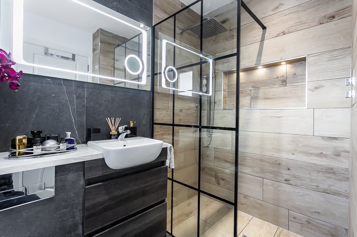 Completing the ground floor, a flexible front-facing room could be used as a fifth bedroom or an additional public room, with features including wood effect flooring and a large built-in cupboard. The upper hall affords access throughout the first floor, including two built-in cupboards; with the master bedroom set to the front, featuring carpeted flooring, a large built-in wardrobe with mirror sliding doors; and a luxurious en-suite shower room including a large cubicle with a rainfall shower and a bespoke shelf, mixed tiled splash walls and flooring, and a fitted mirror with lighting.