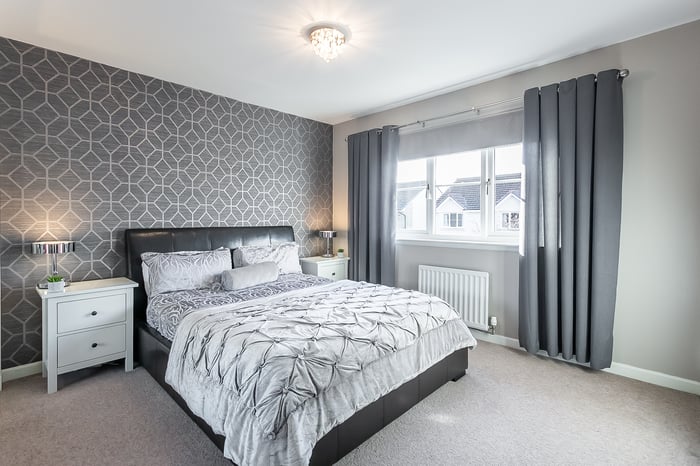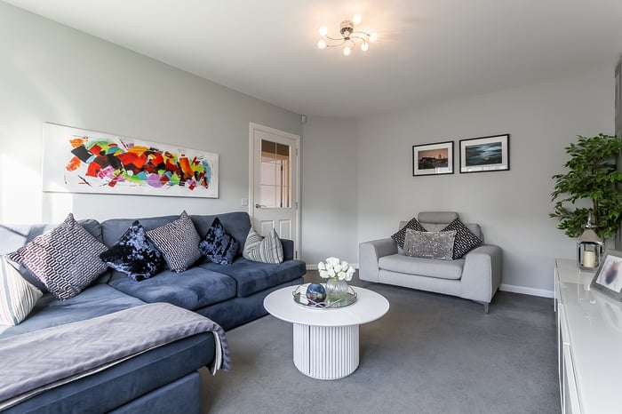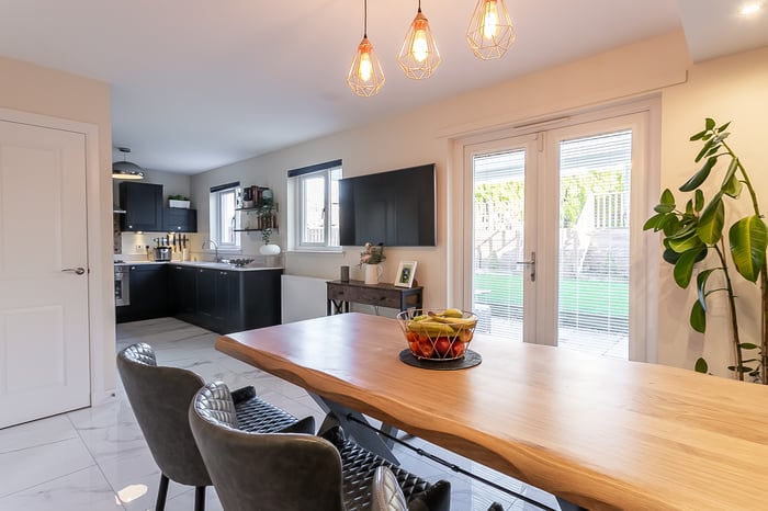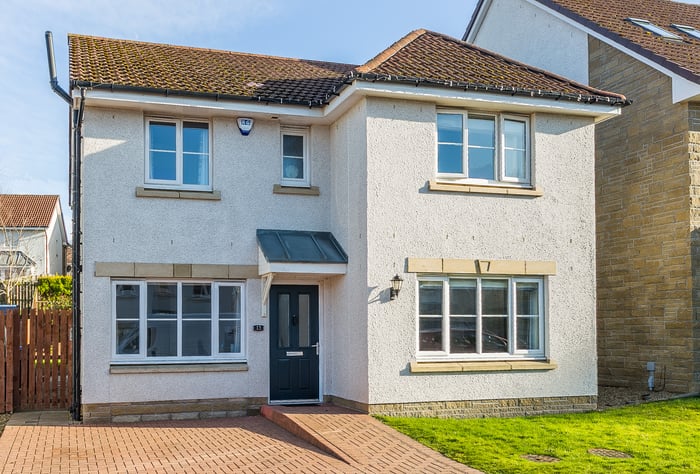 Beautifully presented and spacious, flexible five-bedroom, detached family home with gardens and a double driveway. Located in a modern, maintained and family-orientated residential development in Gorebridge, Midlothian A welcoming entrance gives access to the carpeted staircase and throughout the ground floor, with Porcelain tiled flooring continuing into the dining/kitchen and a convenient WC.