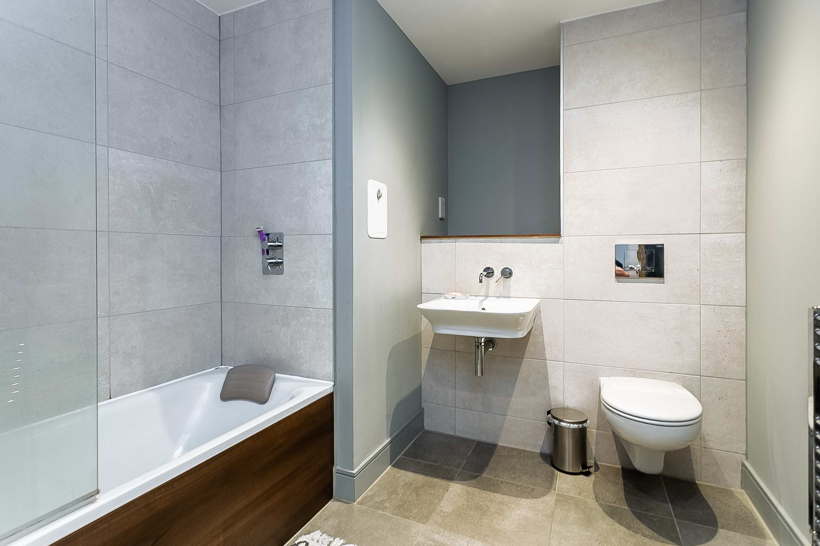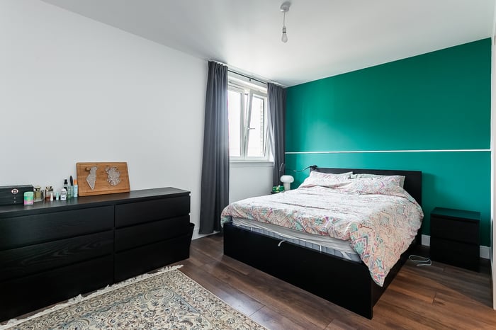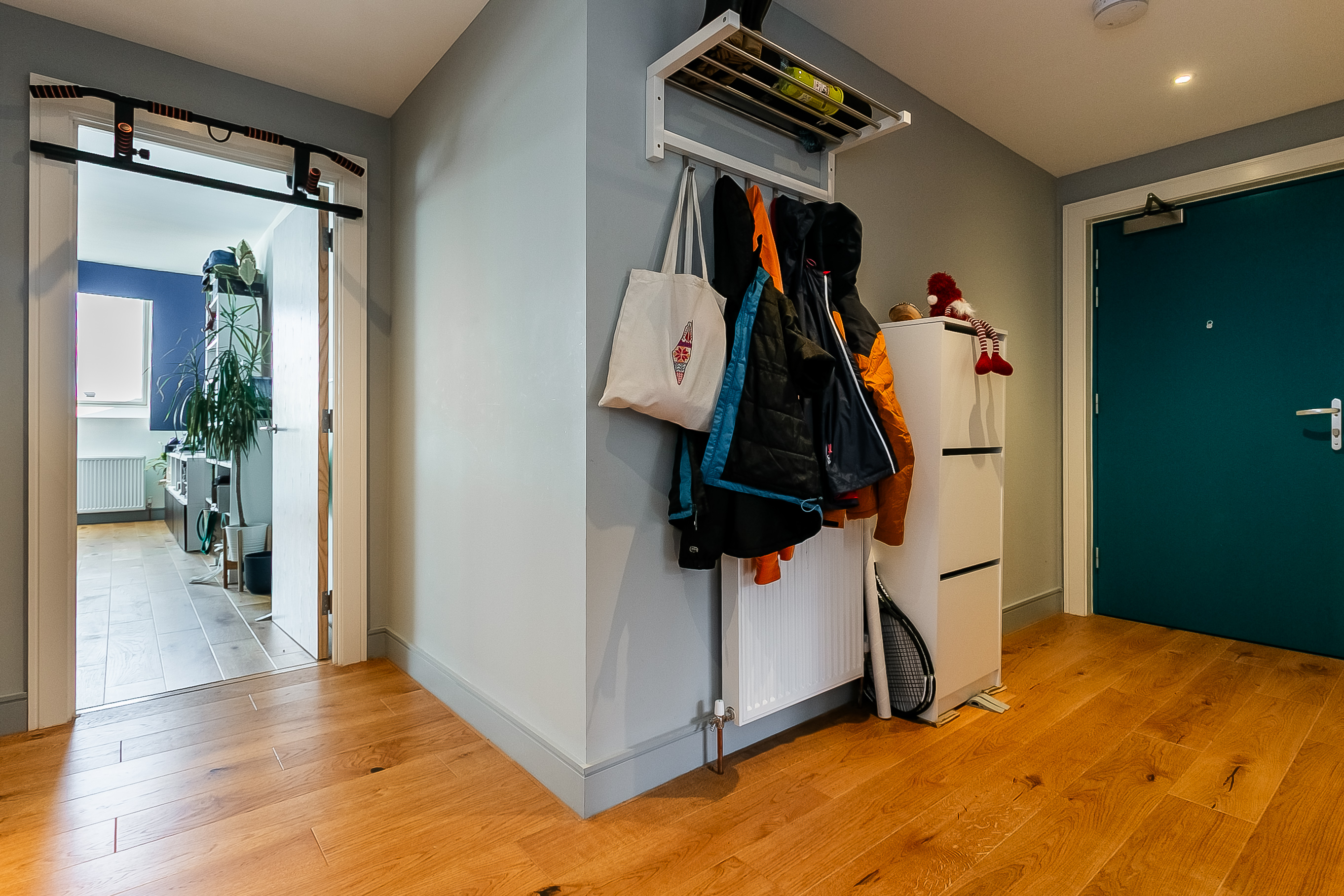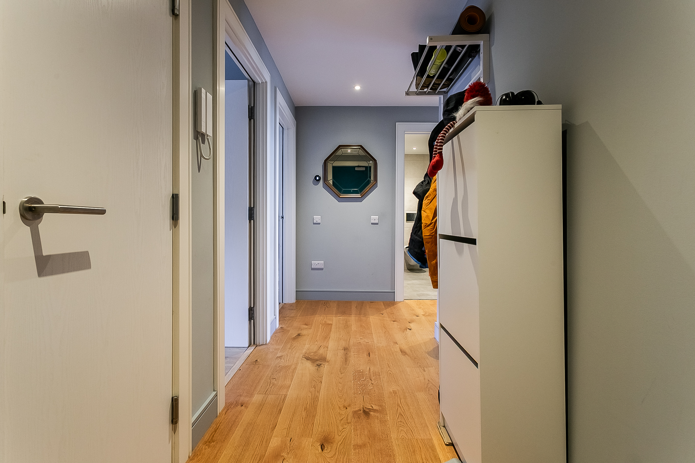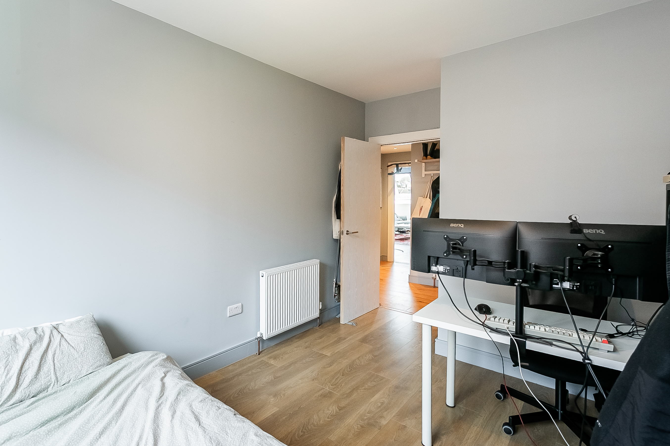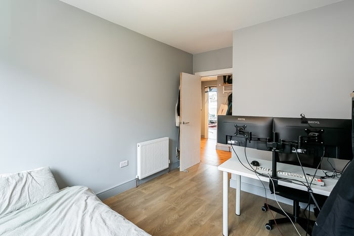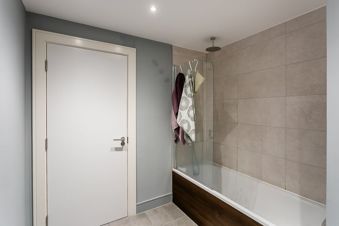 A second well-proportioned double bedroom is finished in light, neutral tones, also with wood-effect flooring. Completing the accommodation, the family-sized bathroom is fitted with a contemporary three-piece suite, including a ceiling-mounted rainfall shower, tiled splash walls, and a ladder-style radiator.