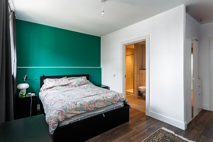 A useful utility cupboard provides additional storage and a freestanding washing machine. To the rear, the spacious master bedroom features wood-effect flooring, ample room for freestanding furniture, and benefits from a large, modern en-suite shower room.