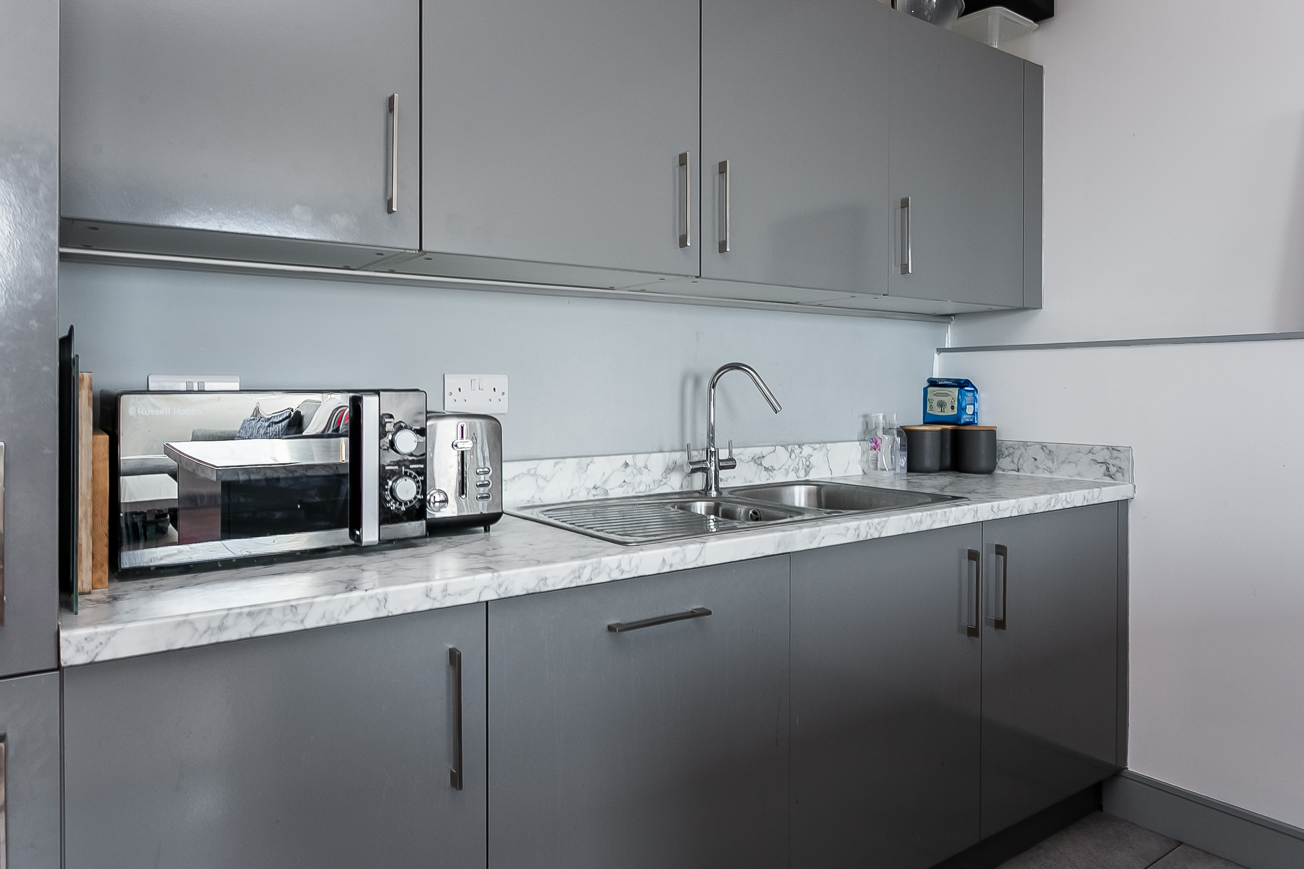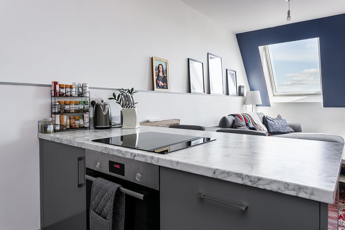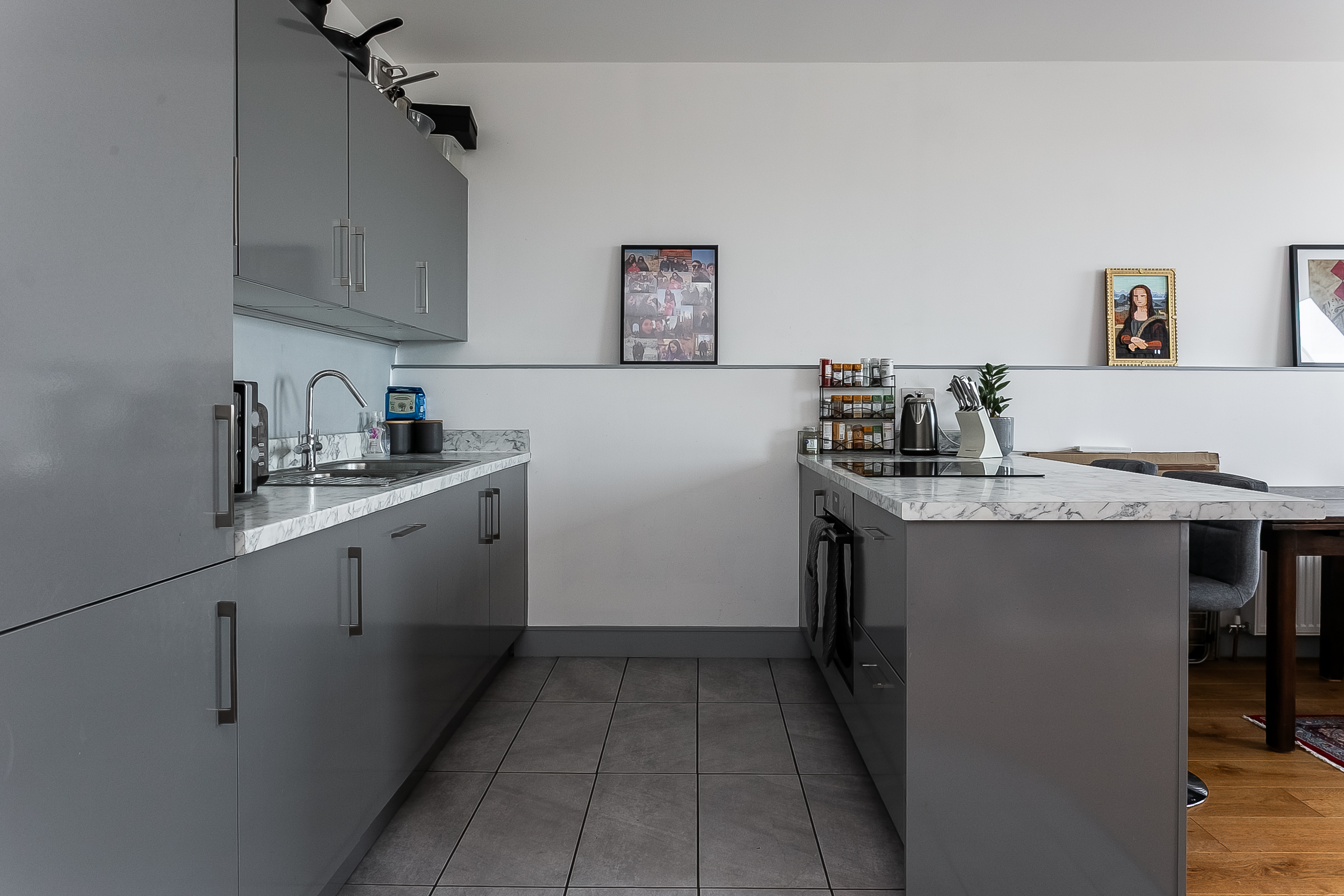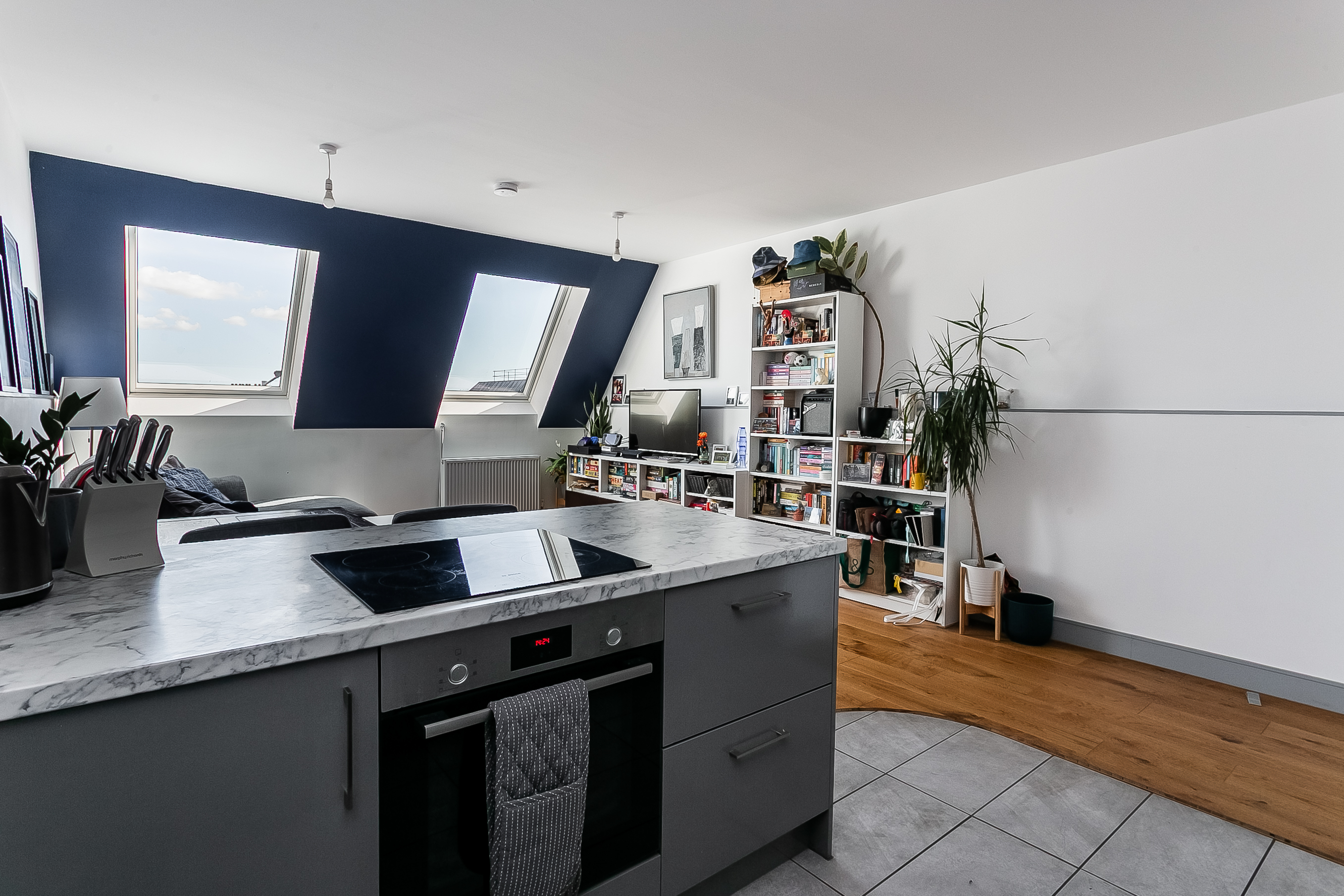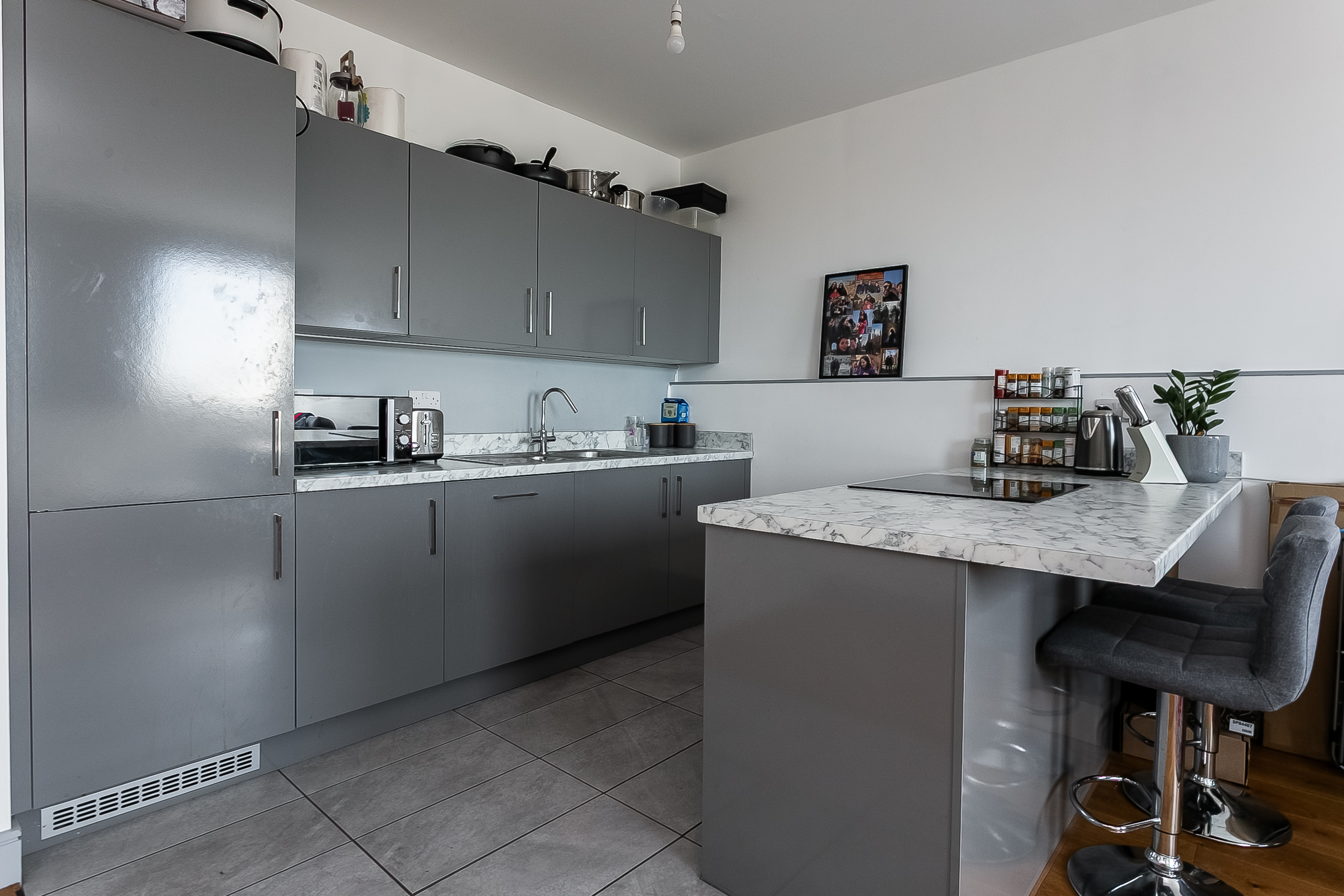 The kitchen area is thoughtfully designed with contemporary units, stone-effect worktops with matching upstands, and a sink with a drainer. A breakfast bar incorporating an induction hob adds both practicality and style, complemented by an integrated oven, fridge/freezer and dishwasher.